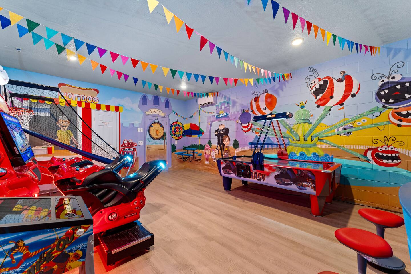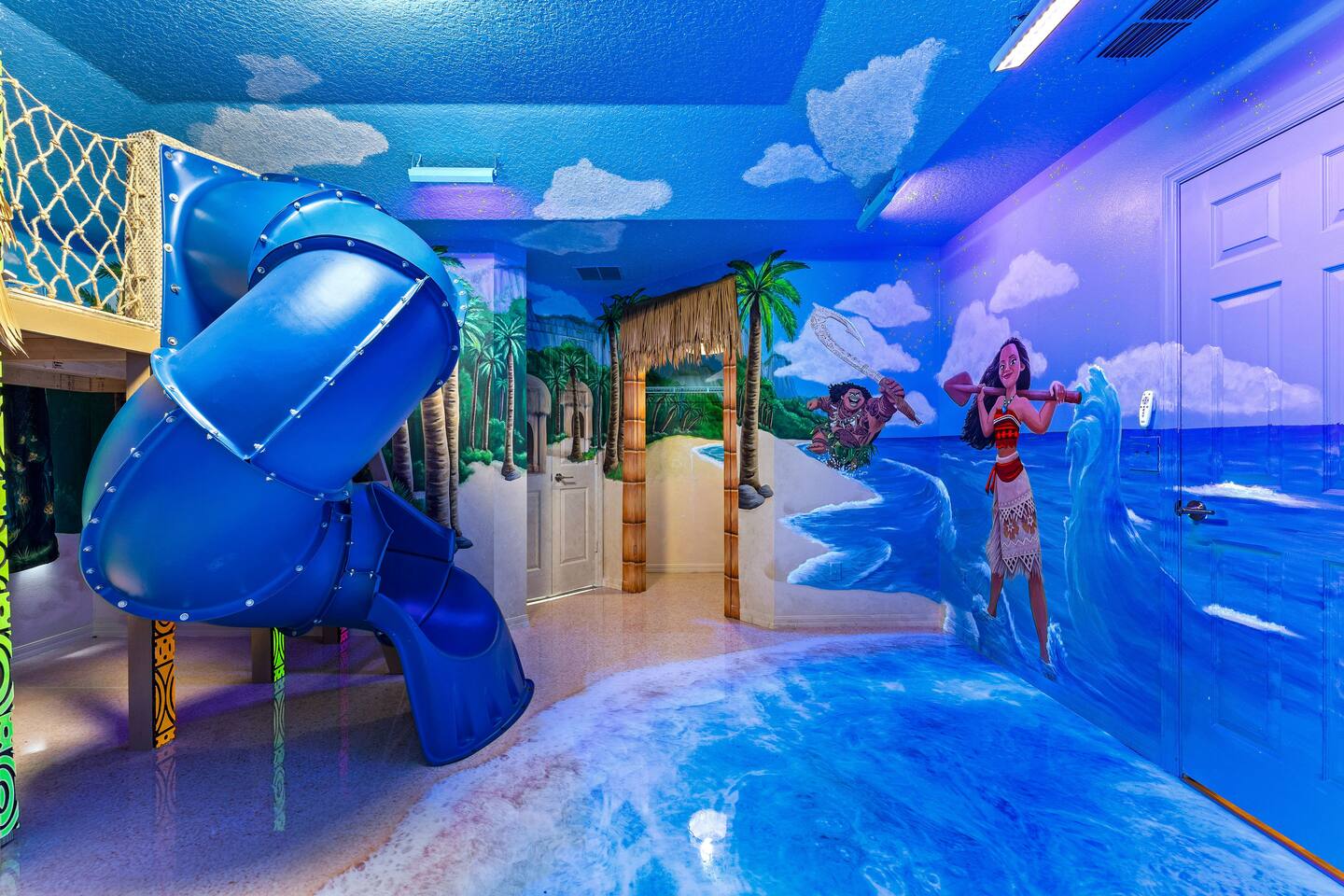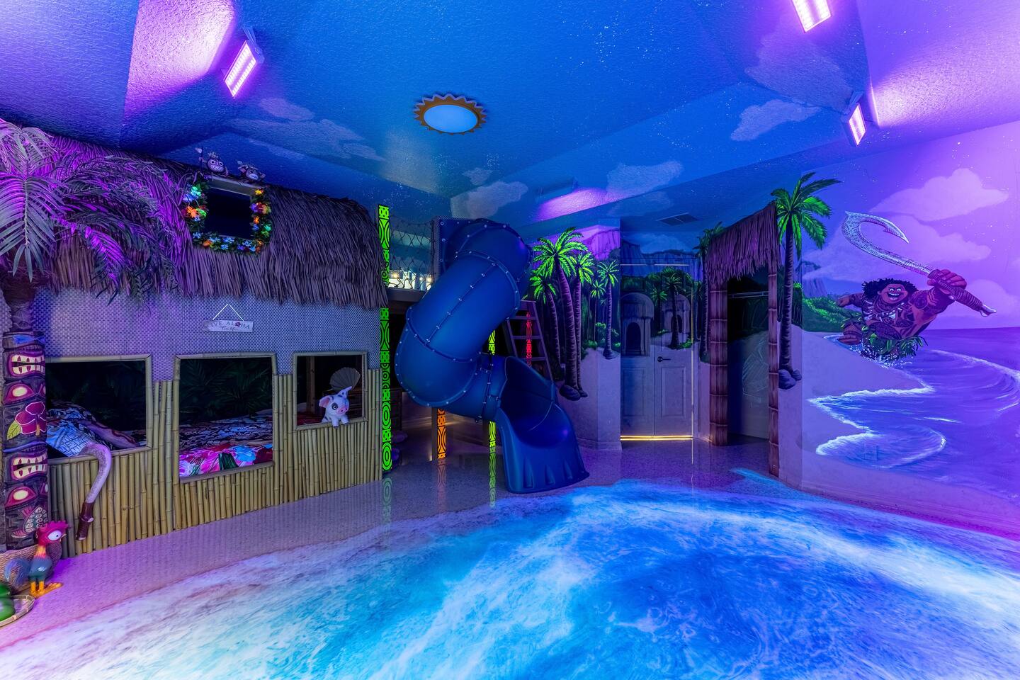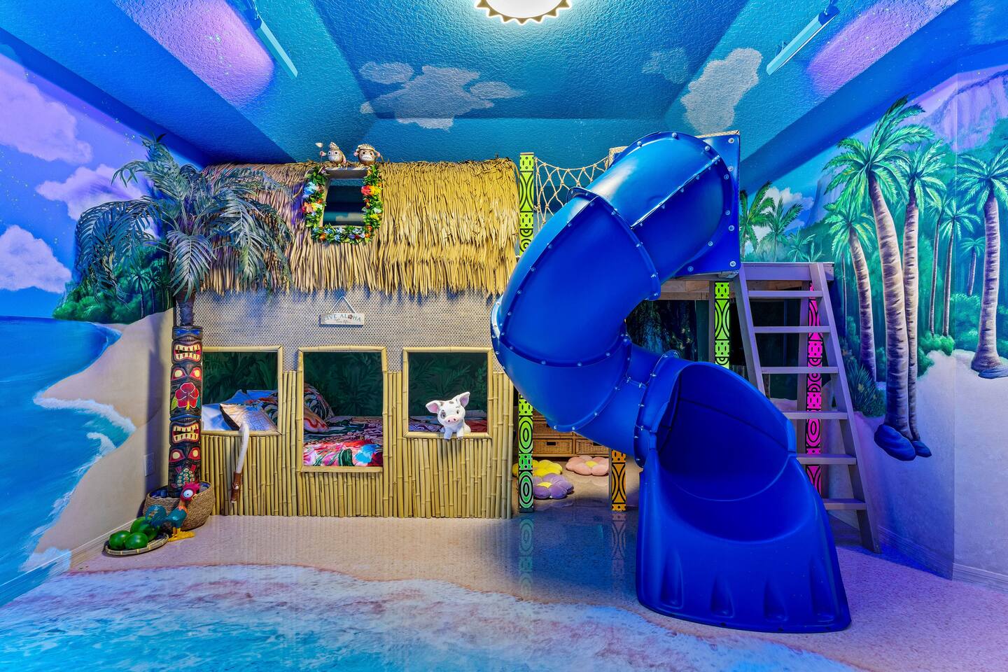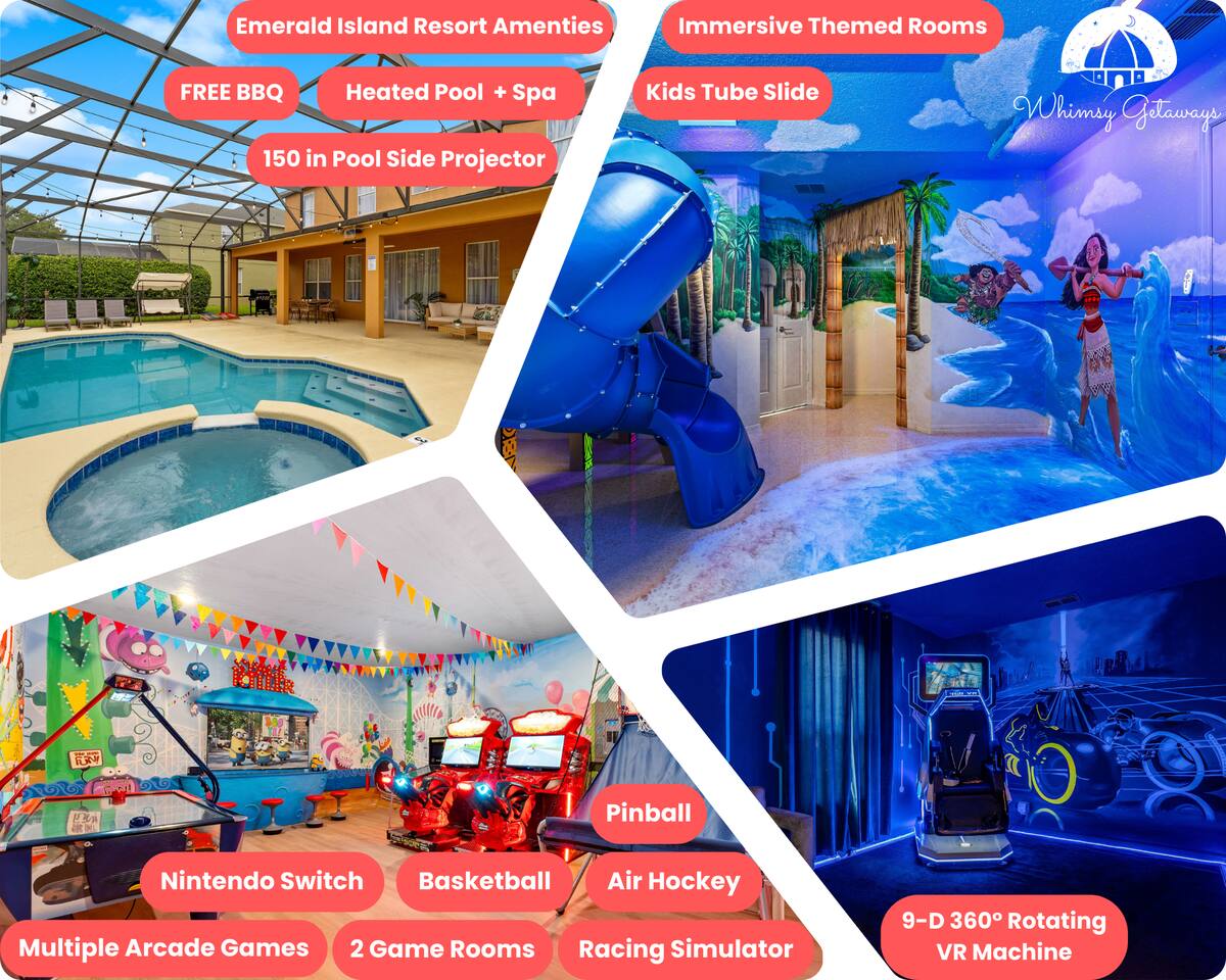 🛖 Tiki Hut over the Reef hosted by the Whimsy Getaways website is a one-of-a-kind villa boasting a mind-blowing 9D 360 degree rotating VR Machine with thrilling rollercoaster rides! Two incredible fully immersive game rooms provide endless entertainment, while 3 fully immersive themed bedrooms will spark your imagination. Subtle themed touches ensure adults enjoy the whimsy too! This spacious villa is the largest floor plans within 4 miles to Disney, is perfect for families seeking an unforgettable escape. Themed Rooms Beyond Your Wildest Dreams! Personalized Service and Care: As the owners of this special home, we're dedicated to providing you with an exceptional experience. Expect a warm welcome, attentive service, and a home that feels like your own. Rent directly from us and discover the difference. Despicable Me Game Room: ‣ 📺 75" Roku TV with 🎮Nintendo Switch ‣ 🏒 Air Hockey Table ‣ 🏍️ Fast and Furious Superbike Racing Simulator, ‣ 🏀 Basketball Shooting Game ‣ 🪓 Kids Friendly Axe Throwing and 🎯 Darts Tron Game Room: ️ ‣ 🥽 Mind Blowing 9D 360-degree Rotating Virtual Reality Machine with thrilling rides! It's like having your own amusement park inside the house! ‣ 🕹️ Retro Arcade Game Machines 🛖 Moana Bedroom ‣ Drift off to dreamland in Moana's beachside Tiki Hut with Moana, Maui, Grandma, Heihei and Pua. ‣ Slide 🛝 down into the beach from the top of the Tiki hut 🏰 Cinderella Bedroom ‣ Sleep in a Fairytale in Cinderella's Carriages among Cinderella, Prince and animal friends. 🏟️ Mario and Donkey Kong Stadium Bedroom: ‣ Watch the battle between Mario and Donkey Kong in Donkey Kong's Stadium! Additional In-house Entertainment: ‣ 🧩 Extensive collection of family-friendly board games ‣ 🎙️Karaoke machine ‣ 📺 Movie night awaits on the 75" Roku TV with smart TV in each room ⛱️ Screened Patio: ‣ 🏊 Private Pool and Spa (Pool and Spa heated for $40/day) ‣ 📽️ 150 inch outdoor projector ‣ 🥩 Complementary use of BBQ Grill (propane not included) ‣ 🔴 Giant Connect 4 and Corn Hole 🧑🍳 Ratatouille inspired Gourmet Kitchen: ‣ 🍽️ Fully stocked kitchen with stainless steel appliances ‣ ☕ Coffee bar 🧑🍼Family-Friendly Amenities: ‣ 🛏️ Pack n play ‣ 🪑High chair 🐶 Dog-Friendly Amenities: ‣ 🐾 Food & water bowls ‣ 🗑️ Waste bags ‣ 🧼 Cleaning supplies ‣ 🔒 Crates (limited availability for rental, inquire during booking) 🏖️ FREE Access to the Resort Amenities with your stay ‣ 🏊 Pool ‣ 🫧 Hot Tub ‣ 🏋️♀️ Fitness Center ‣ Sauna ‣ 🍸 Tiki Bar ‣🖥️ Business Center ‣ 🏞️ Nature Trail ‣ 🛝 Playgrounds ‣ 🪇 Daily Resort Activities Sports Courts: ‣ 🎾 Pickle ball & Tennis Courts ‣ 🏀 Basketball Court ‣ 🏐 Volleyball Court ‣ ⛳ Putting Green ‣ 🏸 Sports Equipment Rental available at the Welcome Center. Additional Perks: ‣ 👮♀️ 24/7 Guarded Gated Community: ‣ 🎢 Disney® is just 4 miles away, with Margaritaville, Universal Studios, and other top attractions easily accessible. ‣ 🧹 5-Stars Cleanliness Guarantee: Arrive to sparkling clean or we'll re-clean concerns.