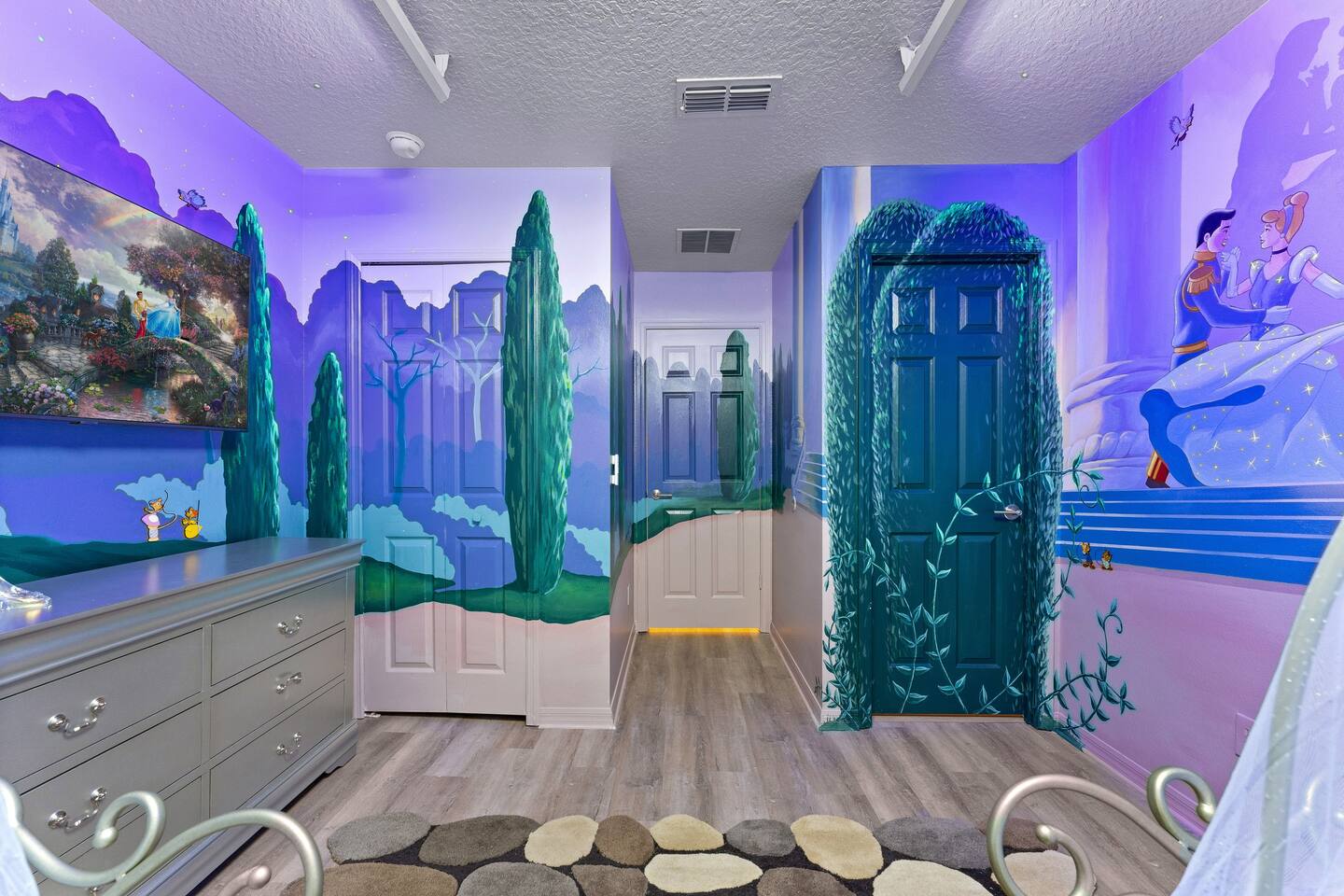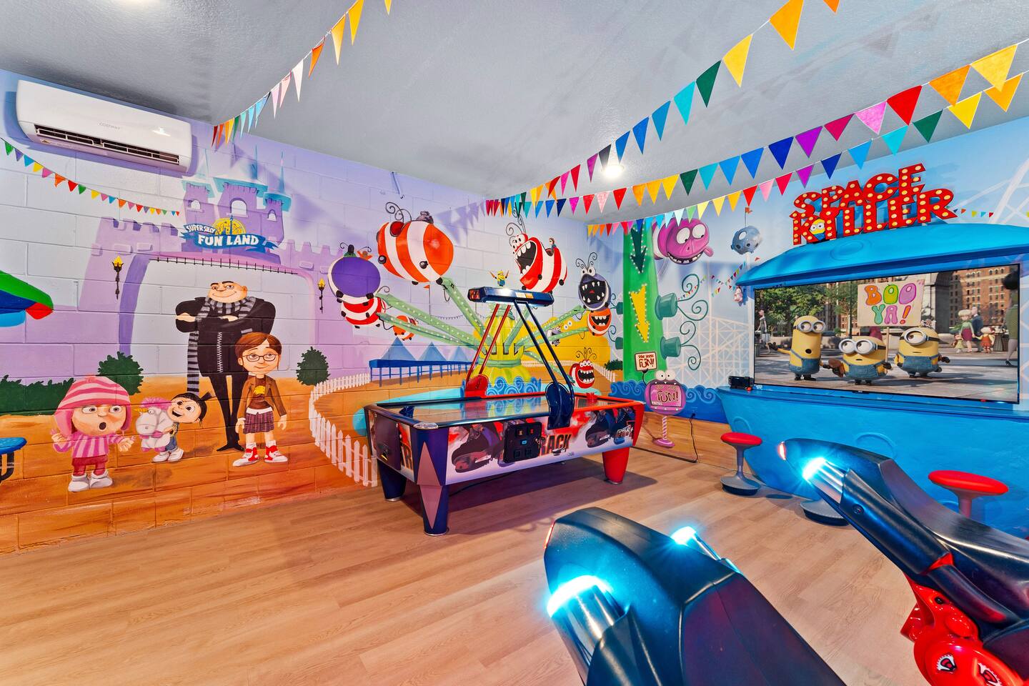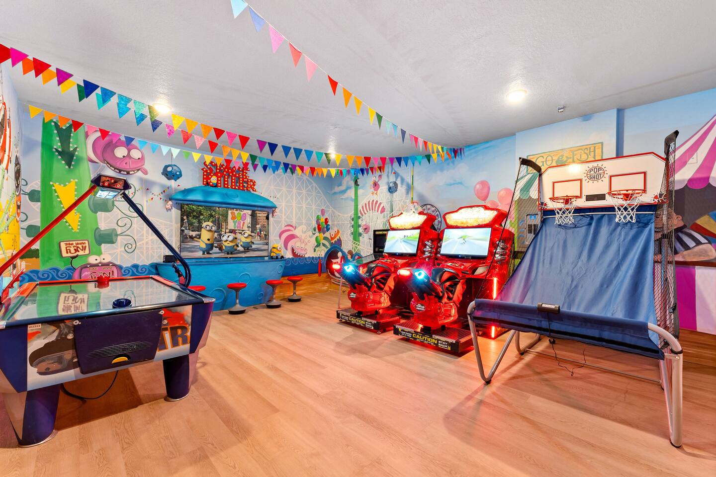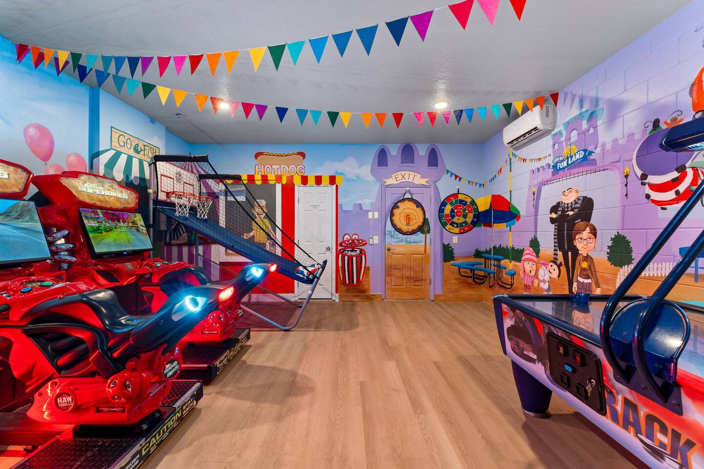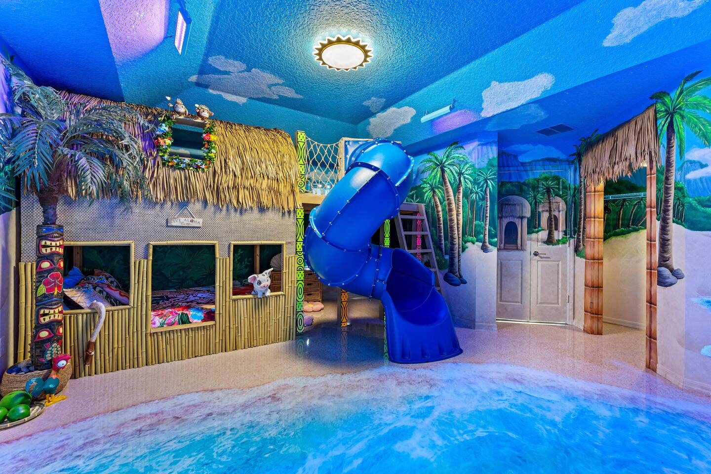 🛖 Tiki Hut over the Reef hosted by the Whimsy Getaways website is a one-of-a-kind villa boasting a mind-blowing 9D 360 degree rotating VR Machine with thrilling rollercoaster rides! Two incredible fully immersive game rooms provide endless entertainment, while 3 fully immersive themed bedrooms will spark your imagination. Subtle themed touches ensure adults enjoy the whimsy too! This spacious villa is the largest floor plans within 4 miles to Disney, is perfect for families seeking an unforgettable escape. Themed Rooms Beyond Your Wildest Dreams! Personalized Service and Care: As the owners of this special home, we're dedicated to providing you with an exceptional experience. Expect a warm welcome, attentive service, and a home that feels like your own. Rent directly from us and discover the difference. Despicable Me Game Room: ‣ 📺 75" Roku TV with 🎮Nintendo Switch ‣ 🏒 Air Hockey Table ‣ 🏍️ Fast and Furious Superbike Racing Simulator, ‣ 🏀 Basketball Shooting Game ‣ 🪓 Kids Friendly Axe Throwing and 🎯 Darts Tron Game Room: ️ ‣ 🥽 Mind Blowing 9D 360-degree Rotating Virtual Reality Machine with thrilling rides! It's like having your own amusement park inside the house! ‣ 🕹️ Retro Arcade Game Machines 🛖 Moana Bedroom ‣ Drift off to dreamland in Moana's beachside Tiki Hut with Moana, Maui, Grandma, Heihei and Pua. ‣ Slide 🛝 down into the beach from the top of the Tiki hut 🏰 Cinderella Bedroom ‣ Sleep in a Fairytale in Cinderella's Carriages among Cinderella, Prince and animal friends. 🏟️ Mario and Donkey Kong Stadium Bedroom: ‣ Watch the battle between Mario and Donkey Kong in Donkey Kong's Stadium! Additional In-house Entertainment: ‣ 🧩 Extensive collection of family-friendly board games ‣ 🎙️Karaoke machine ‣ 📺 Movie night awaits on the 75" Roku TV with smart TV in each room ⛱️ Screened Patio: ‣ 🏊 Private Pool and Spa (Pool and Spa heated for $40/day) ‣ 📽️ 150 inch outdoor projector ‣ 🥩 Complementary use of BBQ Grill (propane not included) ‣ 🔴 Giant Connect 4 and Corn Hole 🧑🍳 Ratatouille inspired Gourmet Kitchen: ‣ 🍽️ Fully stocked kitchen with stainless steel appliances ‣ ☕ Coffee bar 🧑🍼Family-Friendly Amenities: ‣ 🛏️ Pack n play ‣ 🪑High chair 🐶 Dog-Friendly Amenities: ‣ 🐾 Food & water bowls ‣ 🗑️ Waste bags ‣ 🧼 Cleaning supplies ‣ 🔒 Crates (limited availability for rental, inquire during booking) 🏖️ FREE Access to the Resort Amenities with your stay ‣ 🏊 Pool ‣ 🫧 Hot Tub ‣ 🏋️♀️ Fitness Center ‣ Sauna ‣ 🍸 Tiki Bar ‣🖥️ Business Center ‣ 🏞️ Nature Trail ‣ 🛝 Playgrounds ‣ 🪇 Daily Resort Activities Sports Courts: ‣ 🎾 Pickle ball & Tennis Courts ‣ 🏀 Basketball Court ‣ 🏐 Volleyball Court ‣ ⛳ Putting Green ‣ 🏸 Sports Equipment Rental available at the Welcome Center. Additional Perks: ‣ 👮♀️ 24/7 Guarded Gated Community: ‣ 🎢 Disney® is just 4 miles away, with Margaritaville, Universal Studios, and other top attractions easily accessible. ‣ 🧹 5-Stars Cleanliness Guarantee: Arrive to sparkling clean or we'll re-clean concerns.