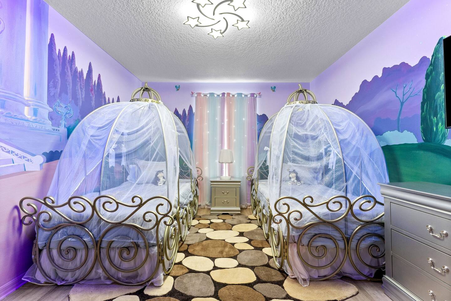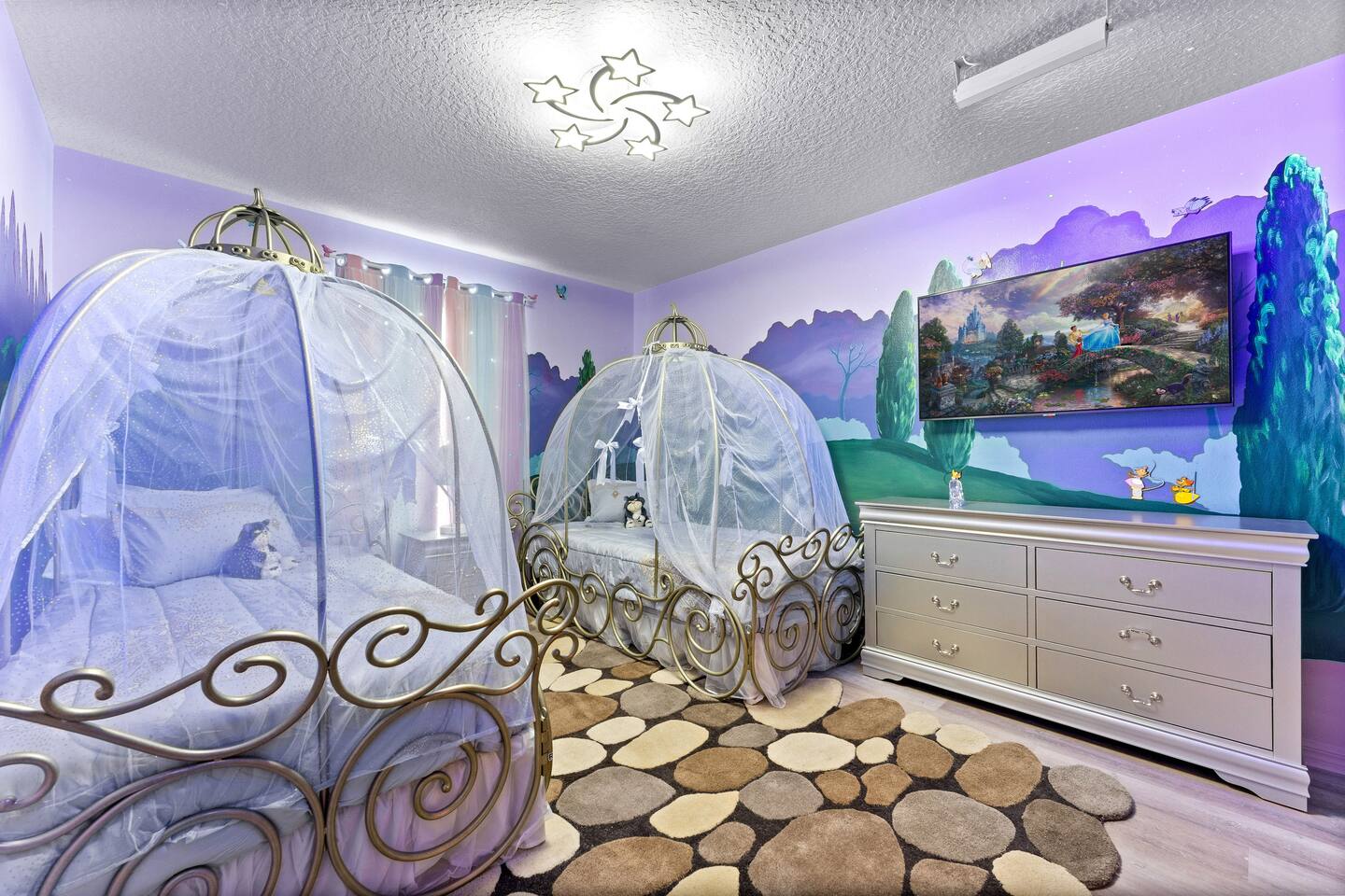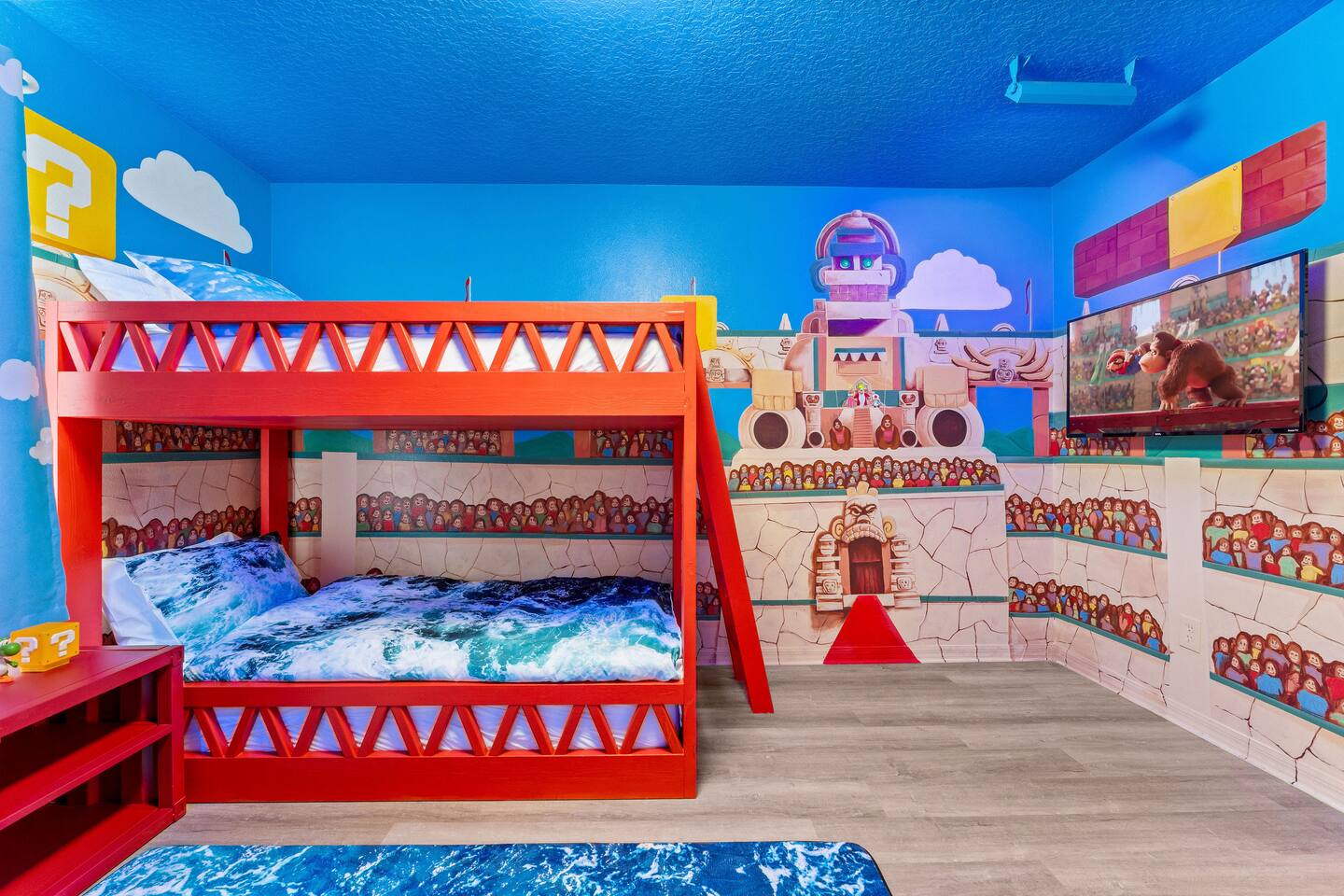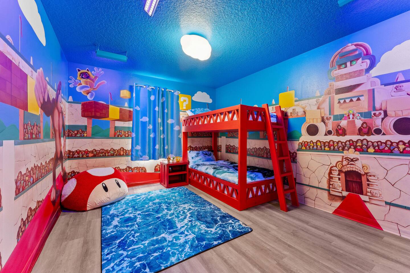 🛖 Tiki Hut over the Reef hosted by the Whimsy Getaways website is a one-of-a-kind villa boasting a mind-blowing 9D 360 degree rotating VR Machine with thrilling rollercoaster rides! Two incredible fully immersive game rooms provide endless entertainment, while 3 fully immersive themed bedrooms will spark your imagination. Subtle themed touches ensure adults enjoy the whimsy too! This spacious villa is the largest floor plans within 4 miles to Disney, is perfect for families seeking an unforgettable escape. Themed Rooms Beyond Your Wildest Dreams! Personalized Service and Care: As the owners of this special home, we're dedicated to providing you with an exceptional experience. Expect a warm welcome, attentive service, and a home that feels like your own. Rent directly from us and discover the difference. Despicable Me Game Room: ‣ 📺 75" Roku TV with 🎮Nintendo Switch ‣ 🏒 Air Hockey Table ‣ 🏍️ Fast and Furious Superbike Racing Simulator, ‣ 🏀 Basketball Shooting Game ‣ 🪓 Kids Friendly Axe Throwing and 🎯 Darts Tron Game Room: ️ ‣ 🥽 Mind Blowing 9D 360-degree Rotating Virtual Reality Machine with thrilling rides! It's like having your own amusement park inside the house! ‣ 🕹️ Retro Arcade Game Machines 🛖 Moana Bedroom ‣ Drift off to dreamland in Moana's beachside Tiki Hut with Moana, Maui, Grandma, Heihei and Pua. ‣ Slide 🛝 down into the beach from the top of the Tiki hut 🏰 Cinderella Bedroom ‣ Sleep in a Fairytale in Cinderella's Carriages among Cinderella, Prince and animal friends. 🏟️ Mario and Donkey Kong Stadium Bedroom: ‣ Watch the battle between Mario and Donkey Kong in Donkey Kong's Stadium! Additional In-house Entertainment: ‣ 🧩 Extensive collection of family-friendly board games ‣ 🎙️Karaoke machine ‣ 📺 Movie night awaits on the 75" Roku TV with smart TV in each room ⛱️ Screened Patio: ‣ 🏊 Private Pool and Spa (Pool and Spa heated for $40/day) ‣ 📽️ 150 inch outdoor projector ‣ 🥩 Complementary use of BBQ Grill (propane not included) ‣ 🔴 Giant Connect 4 and Corn Hole 🧑🍳 Ratatouille inspired Gourmet Kitchen: ‣ 🍽️ Fully stocked kitchen with stainless steel appliances ‣ ☕ Coffee bar 🧑🍼Family-Friendly Amenities: ‣ 🛏️ Pack n play ‣ 🪑High chair 🐶 Dog-Friendly Amenities: ‣ 🐾 Food & water bowls ‣ 🗑️ Waste bags ‣ 🧼 Cleaning supplies ‣ 🔒 Crates (limited availability for rental, inquire during booking) 🏖️ FREE Access to the Resort Amenities with your stay ‣ 🏊 Pool ‣ 🫧 Hot Tub ‣ 🏋️♀️ Fitness Center ‣ Sauna ‣ 🍸 Tiki Bar ‣🖥️ Business Center ‣ 🏞️ Nature Trail ‣ 🛝 Playgrounds ‣ 🪇 Daily Resort Activities Sports Courts: ‣ 🎾 Pickle ball & Tennis Courts ‣ 🏀 Basketball Court ‣ 🏐 Volleyball Court ‣ ⛳ Putting Green ‣ 🏸 Sports Equipment Rental available at the Welcome Center. Additional Perks: ‣ 👮♀️ 24/7 Guarded Gated Community: ‣ 🎢 Disney® is just 4 miles away, with Margaritaville, Universal Studios, and other top attractions easily accessible. ‣ 🧹 5-Stars Cleanliness Guarantee: Arrive to sparkling clean or we'll re-clean concerns.