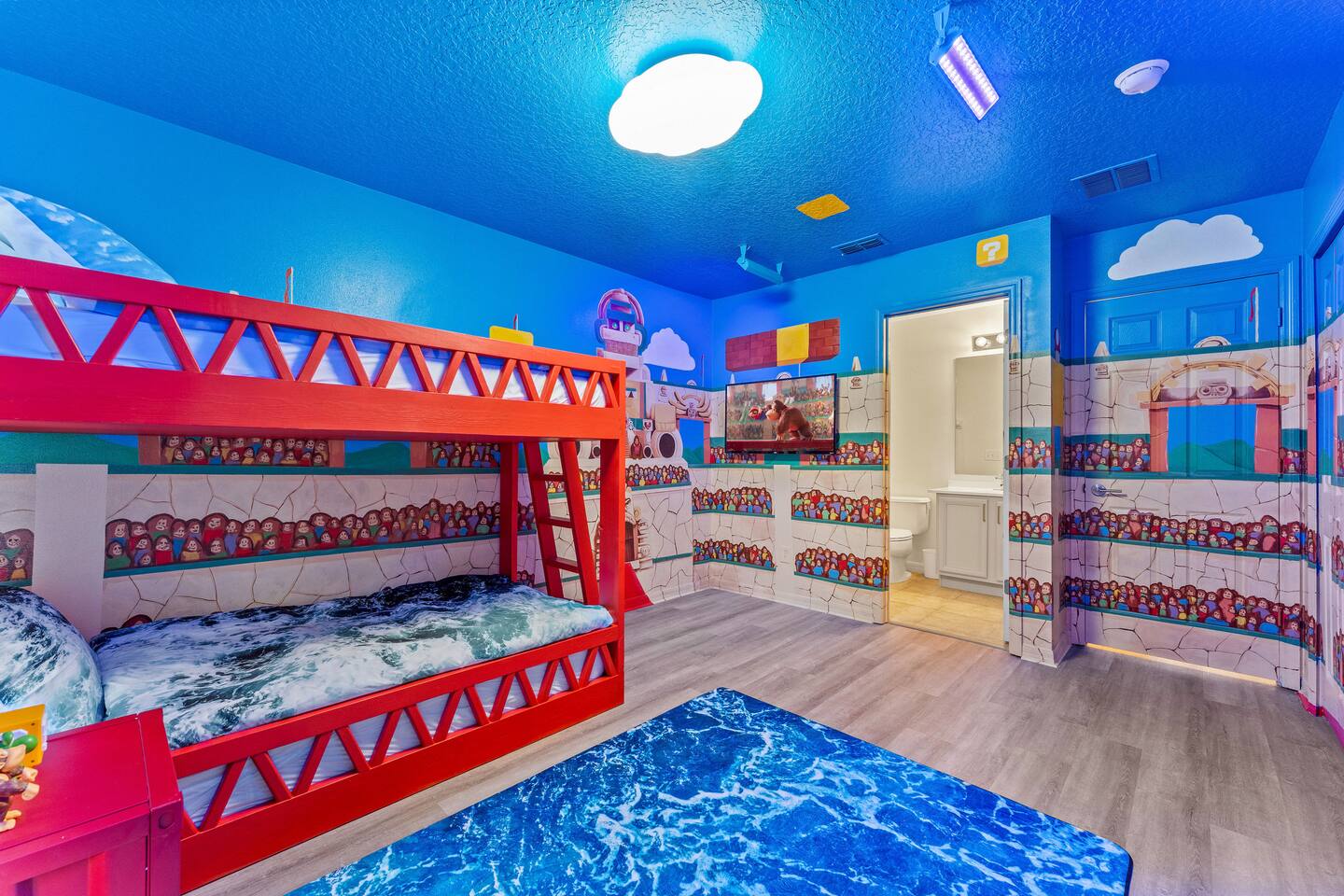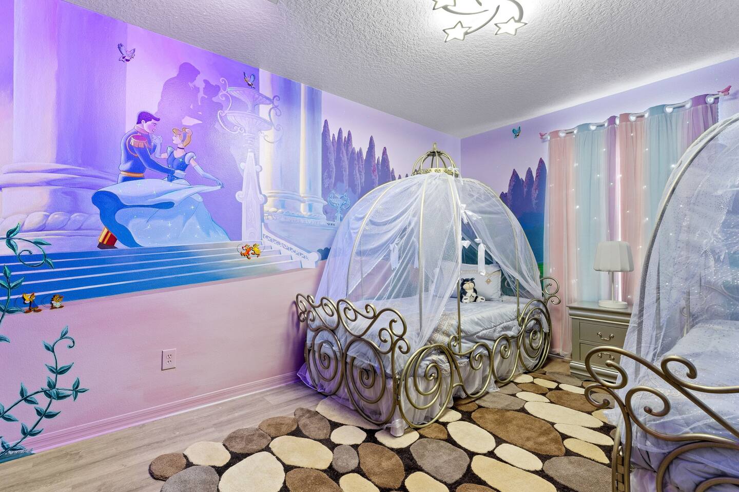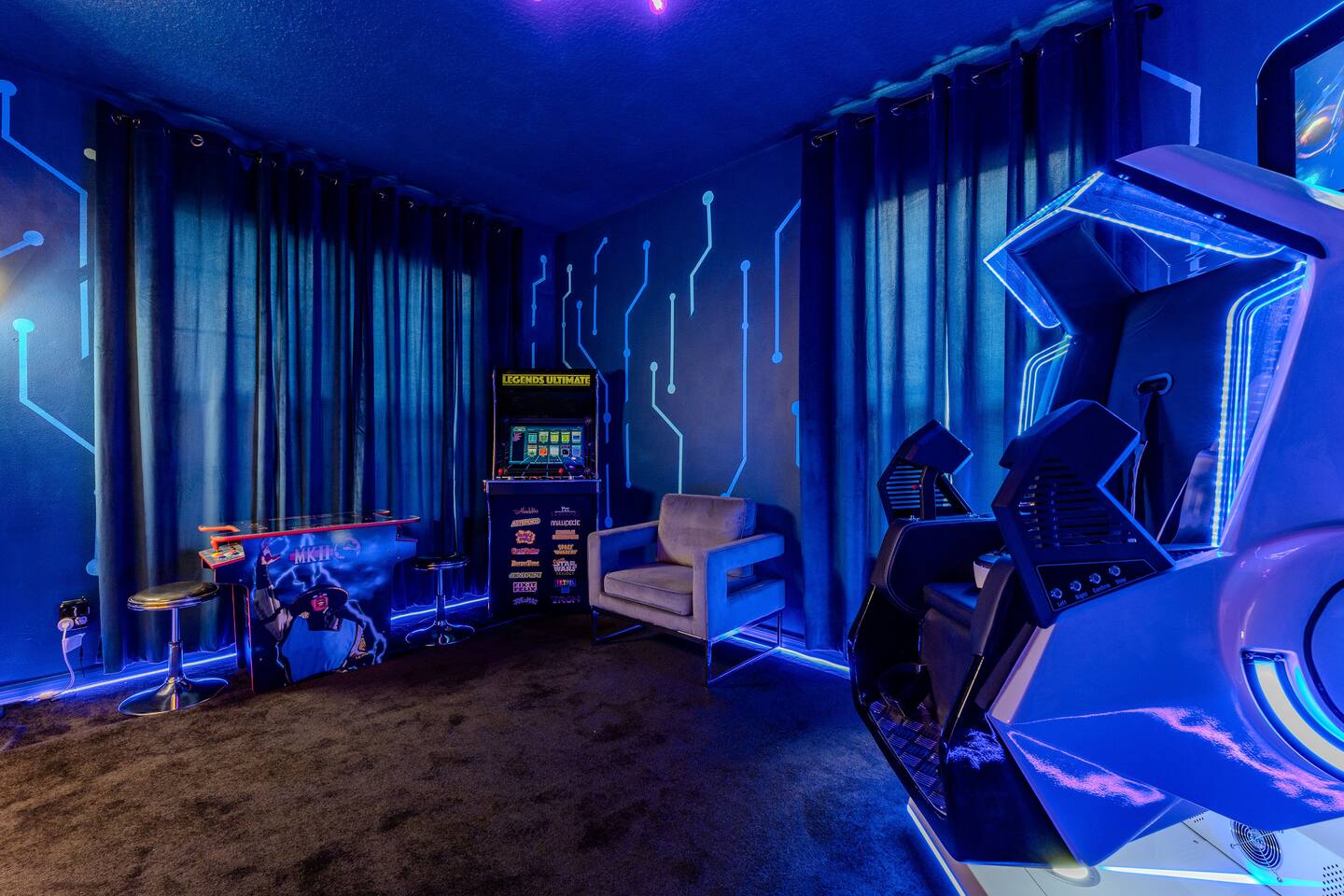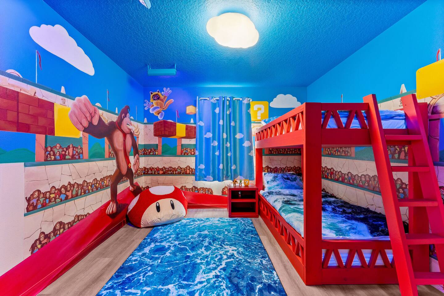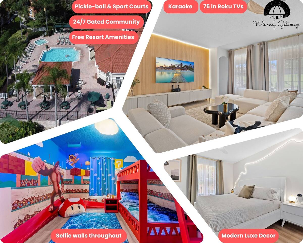 🛖 Tiki Hut over the Reef hosted by the Whimsy Getaways website is a one-of-a-kind villa boasting a mind-blowing 9D 360 degree rotating VR Machine with thrilling rollercoaster rides! Two incredible fully immersive game rooms provide endless entertainment, while 3 fully immersive themed bedrooms will spark your imagination. Subtle themed touches ensure adults enjoy the whimsy too! This spacious villa is the largest floor plans within 4 miles to Disney, is perfect for families seeking an unforgettable escape. Themed Rooms Beyond Your Wildest Dreams! Personalized Service and Care: As the owners of this special home, we're dedicated to providing you with an exceptional experience. Expect a warm welcome, attentive service, and a home that feels like your own. Rent directly from us and discover the difference. Despicable Me Game Room: ‣ 📺 75" Roku TV with 🎮Nintendo Switch ‣ 🏒 Air Hockey Table ‣ 🏍️ Fast and Furious Superbike Racing Simulator, ‣ 🏀 Basketball Shooting Game ‣ 🪓 Kids Friendly Axe Throwing and 🎯 Darts Tron Game Room: ️ ‣ 🥽 Mind Blowing 9D 360-degree Rotating Virtual Reality Machine with thrilling rides! It's like having your own amusement park inside the house! ‣ 🕹️ Retro Arcade Game Machines 🛖 Moana Bedroom ‣ Drift off to dreamland in Moana's beachside Tiki Hut with Moana, Maui, Grandma, Heihei and Pua. ‣ Slide 🛝 down into the beach from the top of the Tiki hut 🏰 Cinderella Bedroom ‣ Sleep in a Fairytale in Cinderella's Carriages among Cinderella, Prince and animal friends. 🏟️ Mario and Donkey Kong Stadium Bedroom: ‣ Watch the battle between Mario and Donkey Kong in Donkey Kong's Stadium! Additional In-house Entertainment: ‣ 🧩 Extensive collection of family-friendly board games ‣ 🎙️Karaoke machine ‣ 📺 Movie night awaits on the 75" Roku TV with smart TV in each room ⛱️ Screened Patio: ‣ 🏊 Private Pool and Spa (Pool and Spa heated for $40/day) ‣ 📽️ 150 inch outdoor projector ‣ 🥩 Complementary use of BBQ Grill (propane not included) ‣ 🔴 Giant Connect 4 and Corn Hole 🧑🍳 Ratatouille inspired Gourmet Kitchen: ‣ 🍽️ Fully stocked kitchen with stainless steel appliances ‣ ☕ Coffee bar 🧑🍼Family-Friendly Amenities: ‣ 🛏️ Pack n play ‣ 🪑High chair 🐶 Dog-Friendly Amenities: ‣ 🐾 Food & water bowls ‣ 🗑️ Waste bags ‣ 🧼 Cleaning supplies ‣ 🔒 Crates (limited availability for rental, inquire during booking) 🏖️ FREE Access to the Resort Amenities with your stay ‣ 🏊 Pool ‣ 🫧 Hot Tub ‣ 🏋️♀️ Fitness Center ‣ Sauna ‣ 🍸 Tiki Bar ‣🖥️ Business Center ‣ 🏞️ Nature Trail ‣ 🛝 Playgrounds ‣ 🪇 Daily Resort Activities Sports Courts: ‣ 🎾 Pickle ball & Tennis Courts ‣ 🏀 Basketball Court ‣ 🏐 Volleyball Court ‣ ⛳ Putting Green ‣ 🏸 Sports Equipment Rental available at the Welcome Center. Additional Perks: ‣ 👮♀️ 24/7 Guarded Gated Community: ‣ 🎢 Disney® is just 4 miles away, with Margaritaville, Universal Studios, and other top attractions easily accessible. ‣ 🧹 5-Stars Cleanliness Guarantee: Arrive to sparkling clean or we'll re-clean concerns.