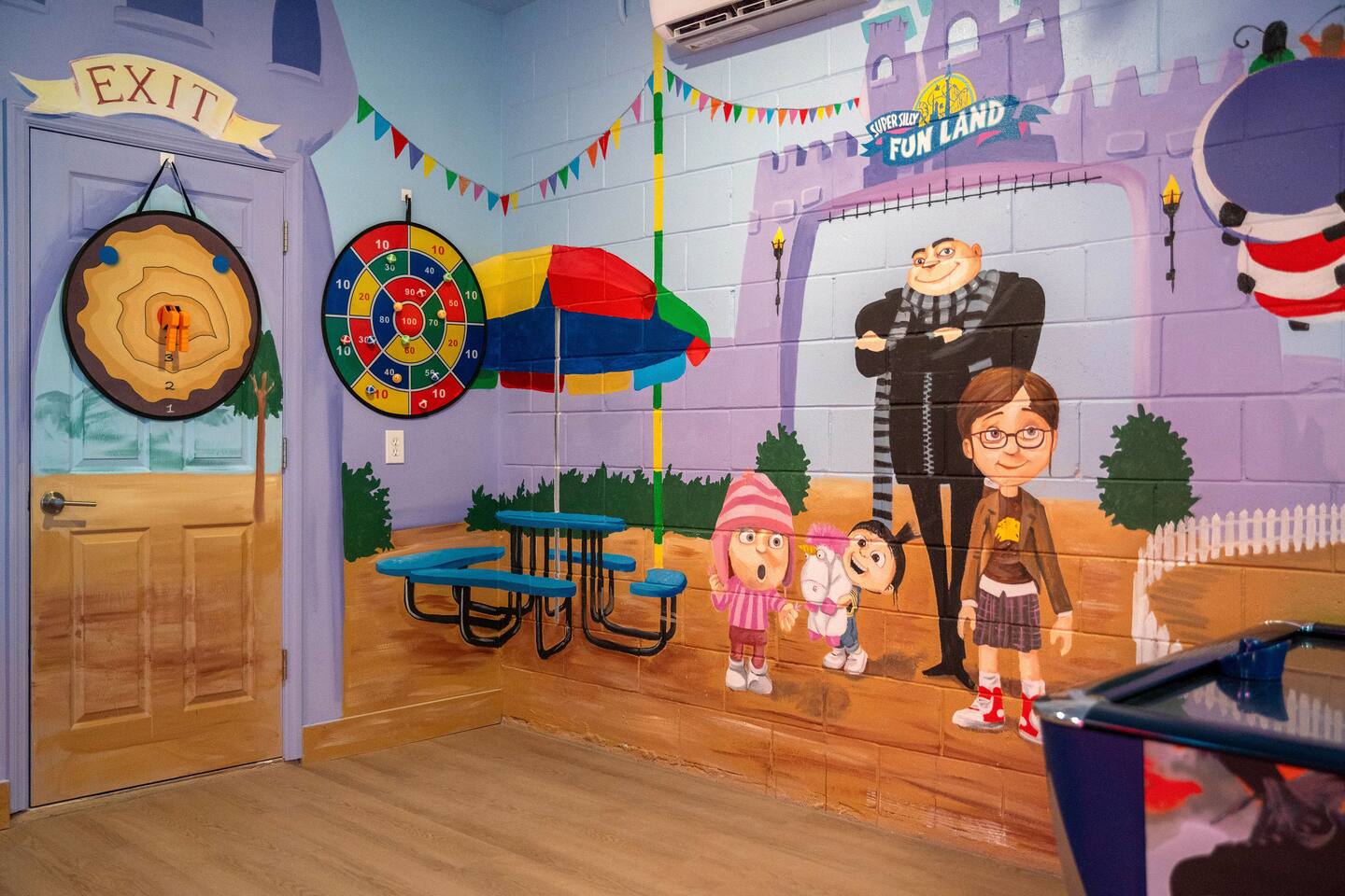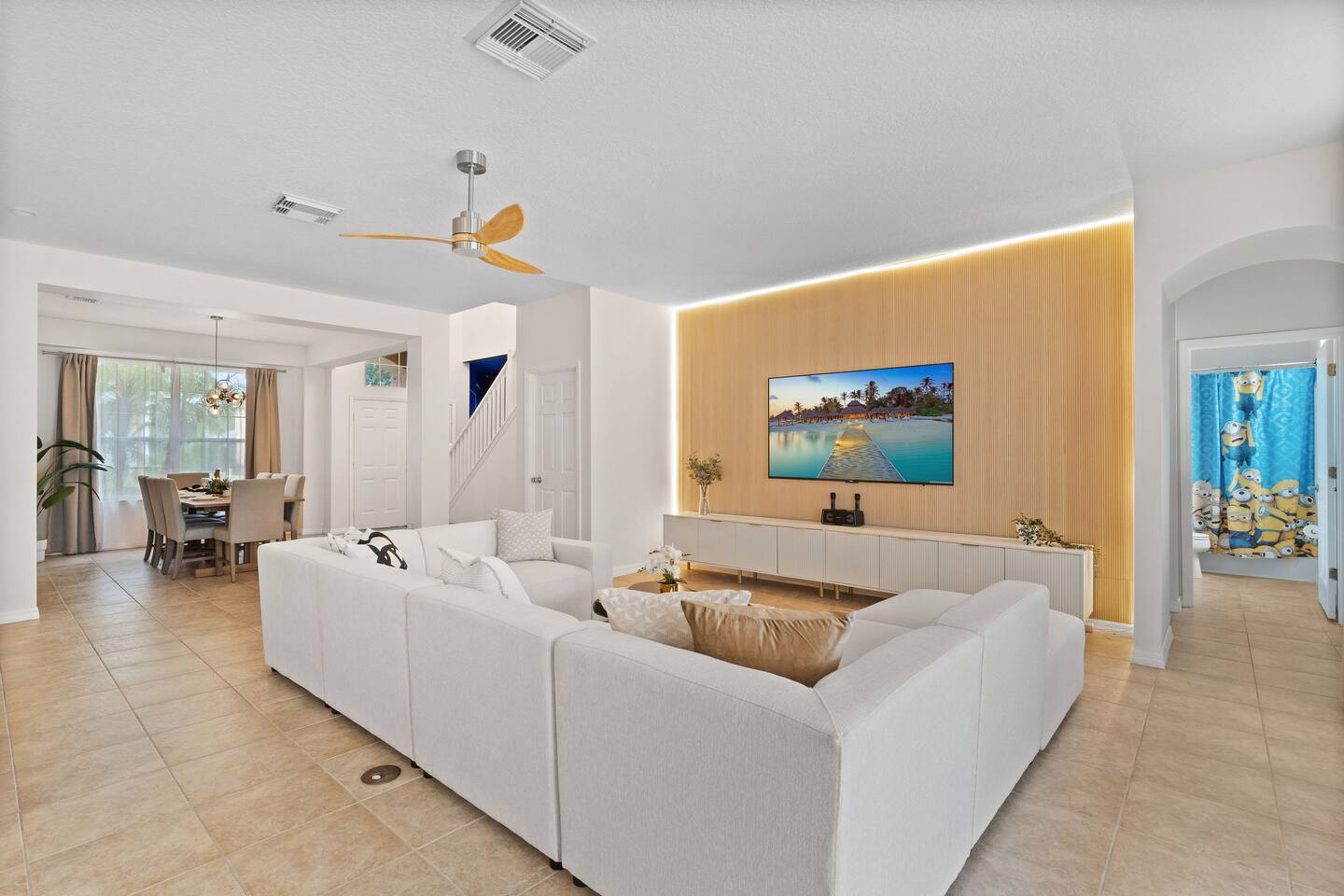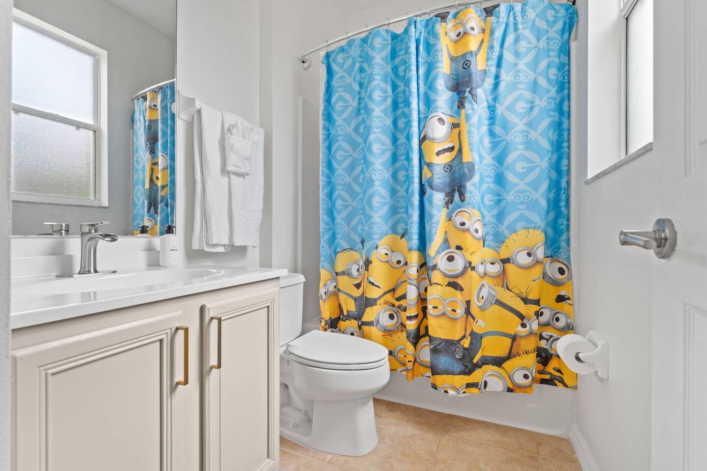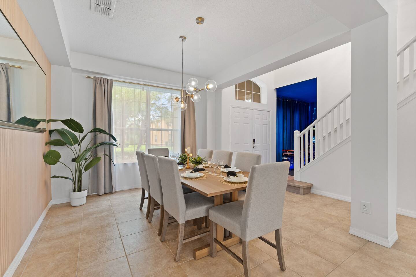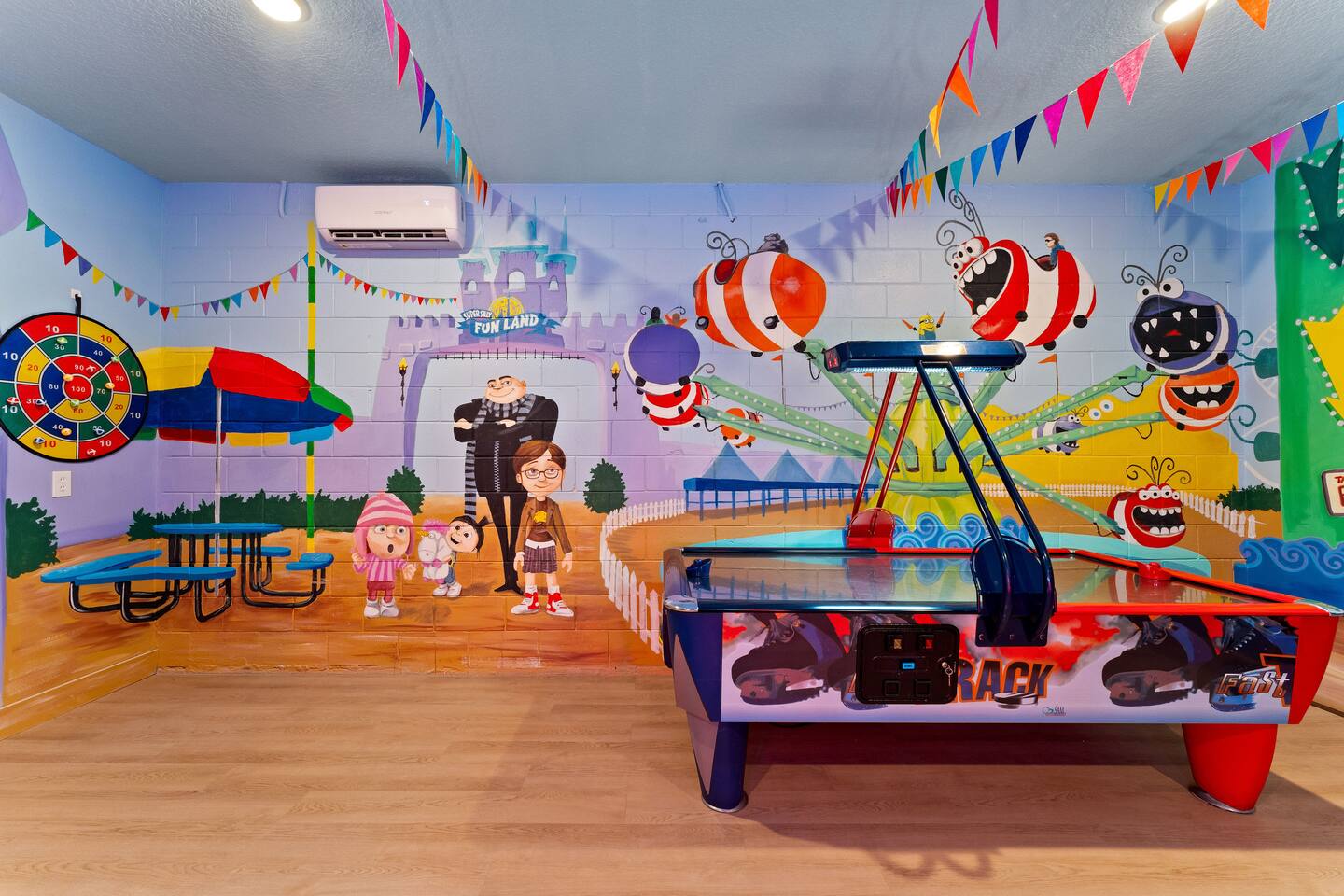 🛖 Tiki Hut over the Reef hosted by the Whimsy Getaways website is a one-of-a-kind villa boasting a mind-blowing 9D 360 degree rotating VR Machine with thrilling rollercoaster rides! Two incredible fully immersive game rooms provide endless entertainment, while 3 fully immersive themed bedrooms will spark your imagination. Subtle themed touches ensure adults enjoy the whimsy too! This spacious villa is the largest floor plans within 4 miles to Disney, is perfect for families seeking an unforgettable escape. Themed Rooms Beyond Your Wildest Dreams! Personalized Service and Care: As the owners of this special home, we're dedicated to providing you with an exceptional experience. Expect a warm welcome, attentive service, and a home that feels like your own. Rent directly from us and discover the difference. Despicable Me Game Room: ‣ 📺 75" Roku TV with 🎮Nintendo Switch ‣ 🏒 Air Hockey Table ‣ 🏍️ Fast and Furious Superbike Racing Simulator, ‣ 🏀 Basketball Shooting Game ‣ 🪓 Kids Friendly Axe Throwing and 🎯 Darts Tron Game Room: ️ ‣ 🥽 Mind Blowing 9D 360-degree Rotating Virtual Reality Machine with thrilling rides! It's like having your own amusement park inside the house! ‣ 🕹️ Retro Arcade Game Machines 🛖 Moana Bedroom ‣ Drift off to dreamland in Moana's beachside Tiki Hut with Moana, Maui, Grandma, Heihei and Pua. ‣ Slide 🛝 down into the beach from the top of the Tiki hut 🏰 Cinderella Bedroom ‣ Sleep in a Fairytale in Cinderella's Carriages among Cinderella, Prince and animal friends. 🏟️ Mario and Donkey Kong Stadium Bedroom: ‣ Watch the battle between Mario and Donkey Kong in Donkey Kong's Stadium! Additional In-house Entertainment: ‣ 🧩 Extensive collection of family-friendly board games ‣ 🎙️Karaoke machine ‣ 📺 Movie night awaits on the 75" Roku TV with smart TV in each room ⛱️ Screened Patio: ‣ 🏊 Private Pool and Spa (Pool and Spa heated for $40/day) ‣ 📽️ 150 inch outdoor projector ‣ 🥩 Complementary use of BBQ Grill (propane not included) ‣ 🔴 Giant Connect 4 and Corn Hole 🧑🍳 Ratatouille inspired Gourmet Kitchen: ‣ 🍽️ Fully stocked kitchen with stainless steel appliances ‣ ☕ Coffee bar 🧑🍼Family-Friendly Amenities: ‣ 🛏️ Pack n play ‣ 🪑High chair 🐶 Dog-Friendly Amenities: ‣ 🐾 Food & water bowls ‣ 🗑️ Waste bags ‣ 🧼 Cleaning supplies ‣ 🔒 Crates (limited availability for rental, inquire during booking) 🏖️ FREE Access to the Resort Amenities with your stay ‣ 🏊 Pool ‣ 🫧 Hot Tub ‣ 🏋️♀️ Fitness Center ‣ Sauna ‣ 🍸 Tiki Bar ‣🖥️ Business Center ‣ 🏞️ Nature Trail ‣ 🛝 Playgrounds ‣ 🪇 Daily Resort Activities Sports Courts: ‣ 🎾 Pickle ball & Tennis Courts ‣ 🏀 Basketball Court ‣ 🏐 Volleyball Court ‣ ⛳ Putting Green ‣ 🏸 Sports Equipment Rental available at the Welcome Center. Additional Perks: ‣ 👮♀️ 24/7 Guarded Gated Community: ‣ 🎢 Disney® is just 4 miles away, with Margaritaville, Universal Studios, and other top attractions easily accessible. ‣ 🧹 5-Stars Cleanliness Guarantee: Arrive to sparkling clean or we'll re-clean concerns.