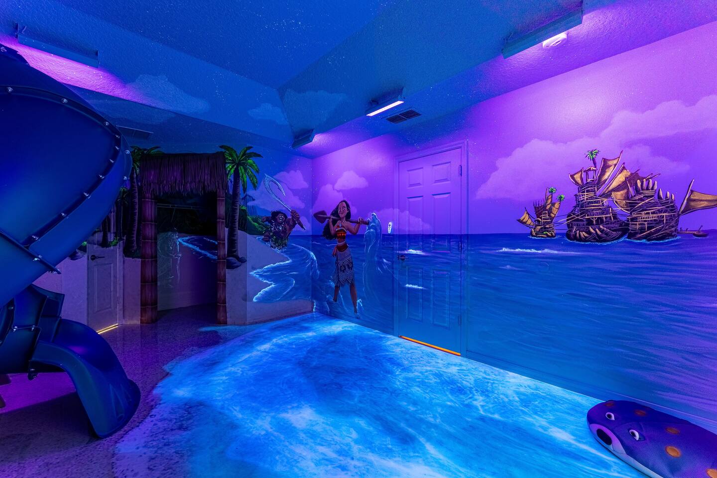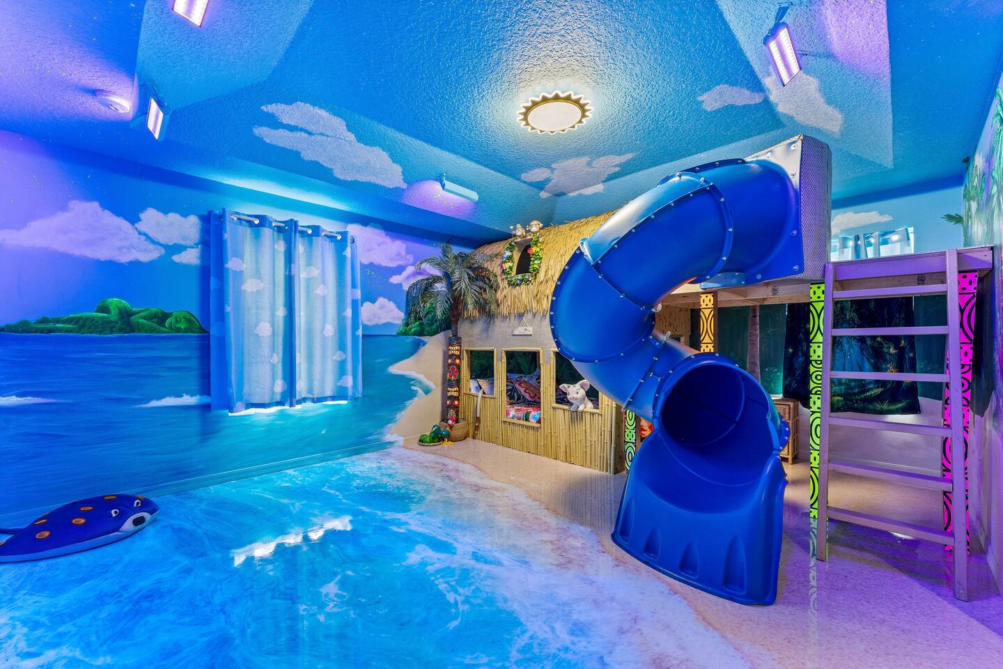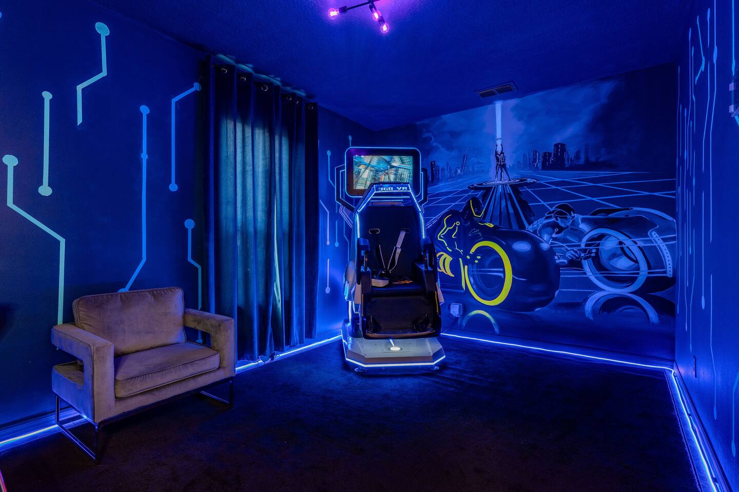 Tiki Hut over the Reef hosted by Whimsy Getaways website is a one-of-a-kind villa boasting a mind-blowing 9D 360° rotating VR Machine with thrilling rollercoaster rides! 2 incredible fully immersive game rooms provide endless entertainment, while 3 fully immersive themed bedrooms will spark your imagination. Subtle themed touches ensure adults enjoy the whimsy too! This spacious villa is the largest floor plan within 4 miles to Disney, is perfect for families seeking an unforgettable escape.