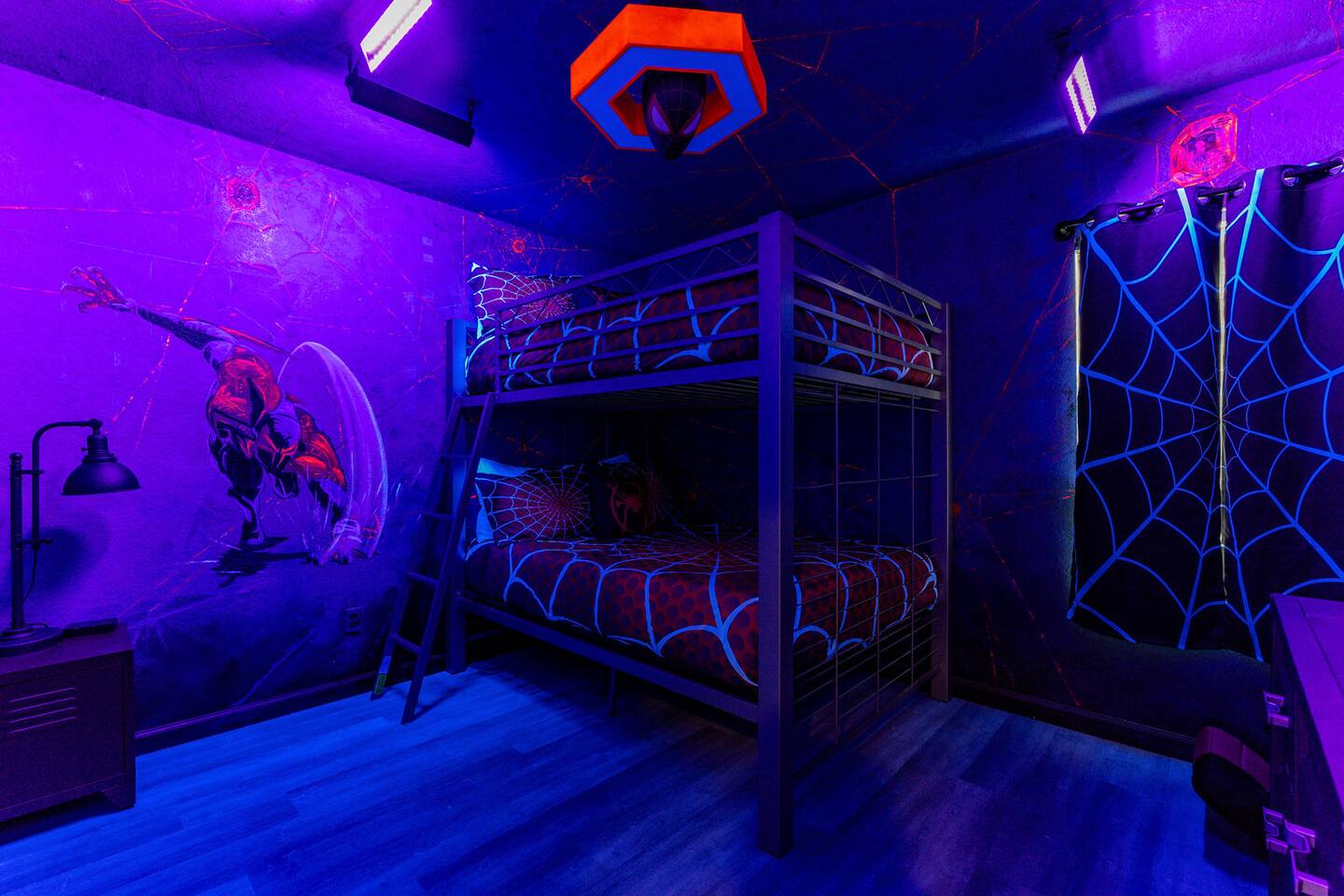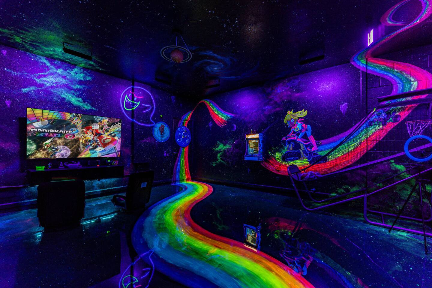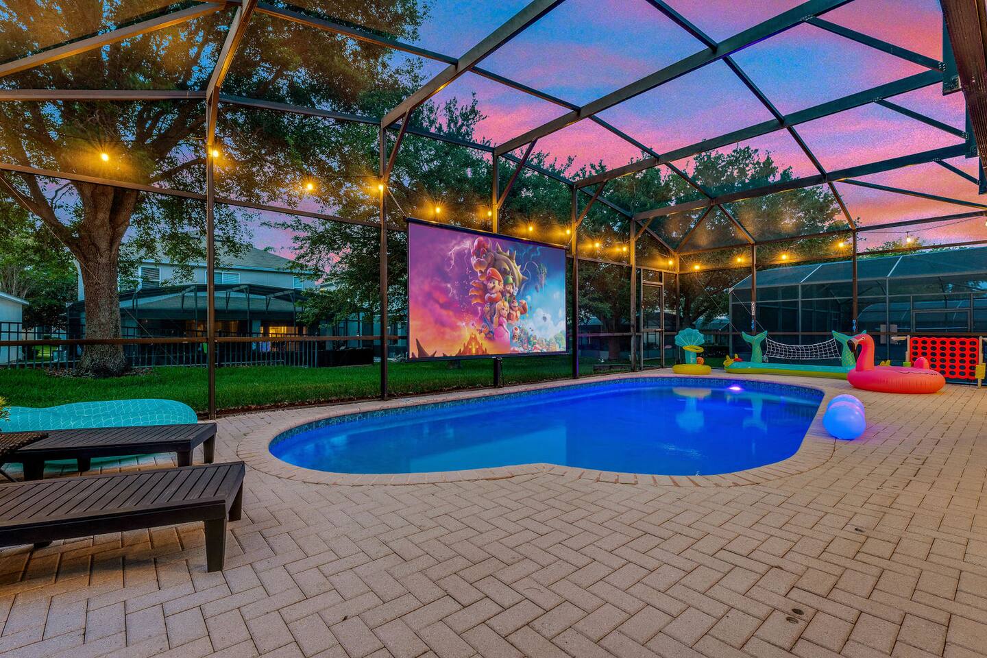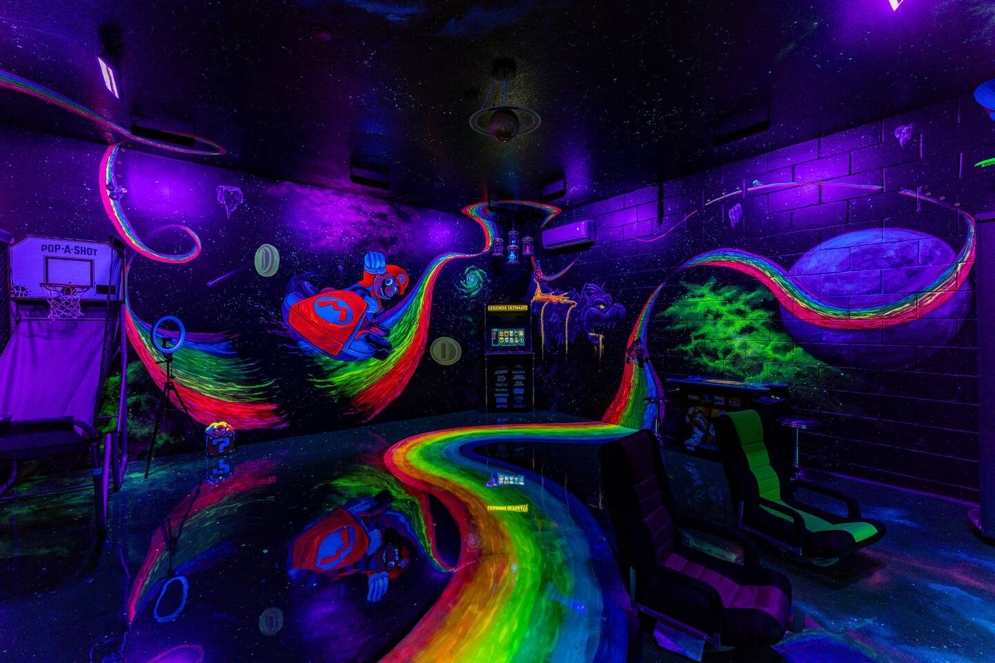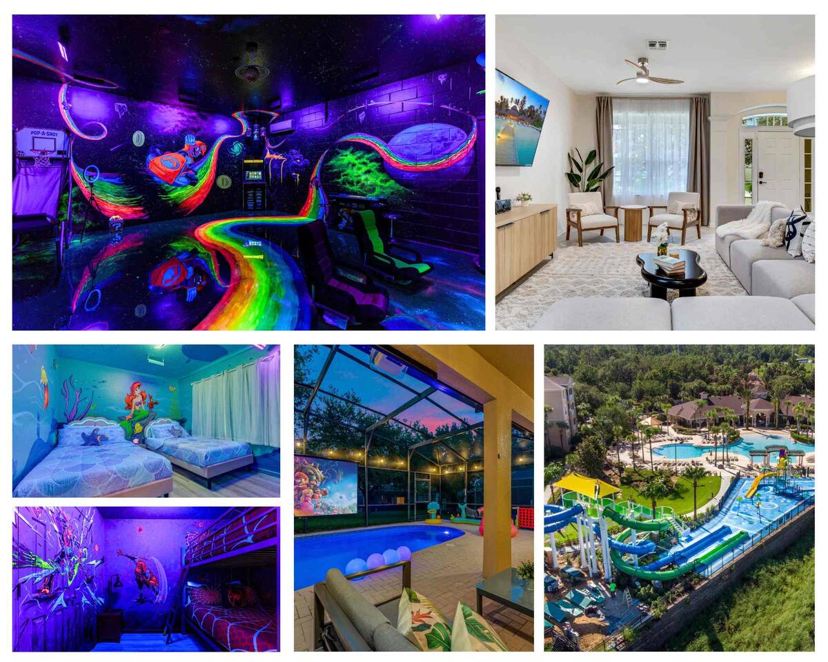 Race with Mario & friends on the Cosmic Rainbow! Video Walkthrough: https://www.youtube.com/watch?v=L3-kLuvDcc8 🏞️ Resort Clubhouse with Pool, Hot Tub, Water Slides, Arcade, Movie Theatre, Gym, Tennis, Basketball, Volleyball, Ping Pong, Pickleball, Park 🌌 Immersive Worlds: 🌈VR in Mario's Rainbow Bridge Arcade, 🧜♀️drift off in Ariel's underwater bedroom, 🕸️swing across the Spiderverse's action-packed bedroom 🍽️ Chef's Kitchen & Poolside Fun: Whip up feasts, chill by the heated pool 🎢 Minutes to Disney & Universal Studios! 🐾 Dog friendly
