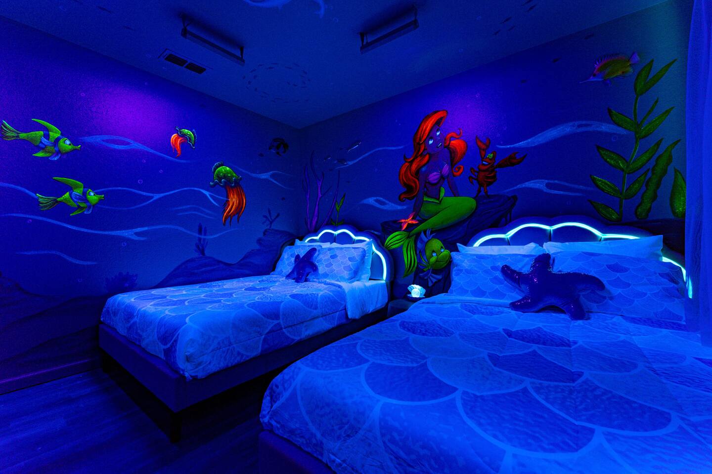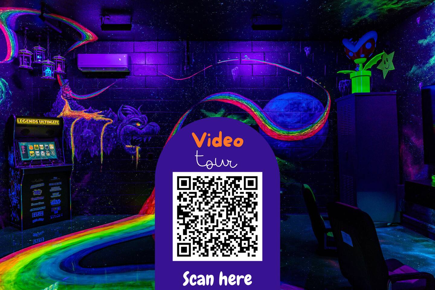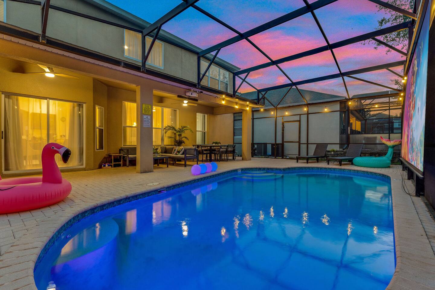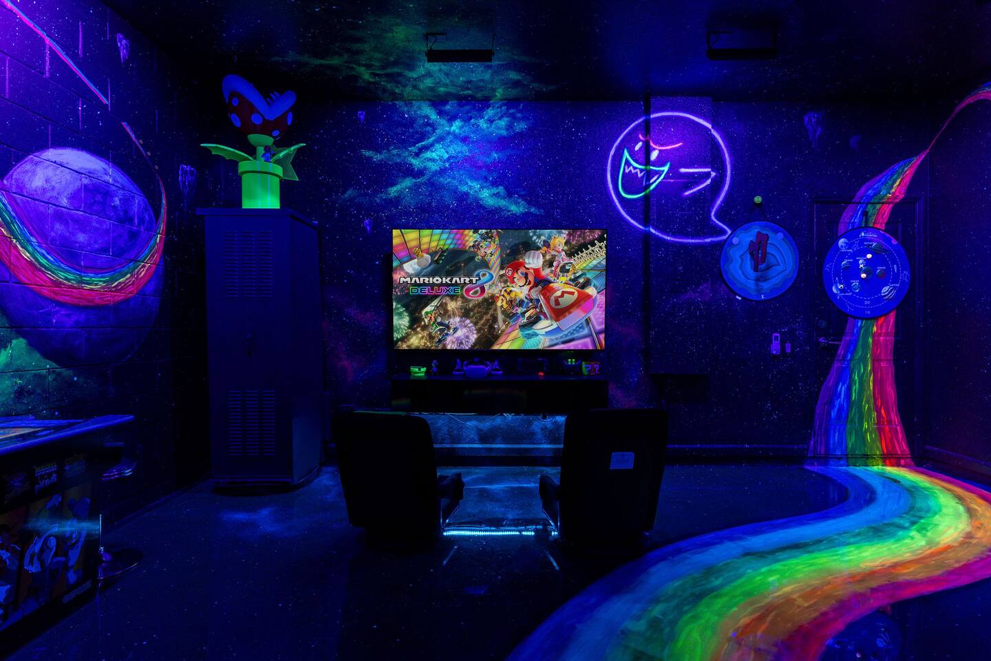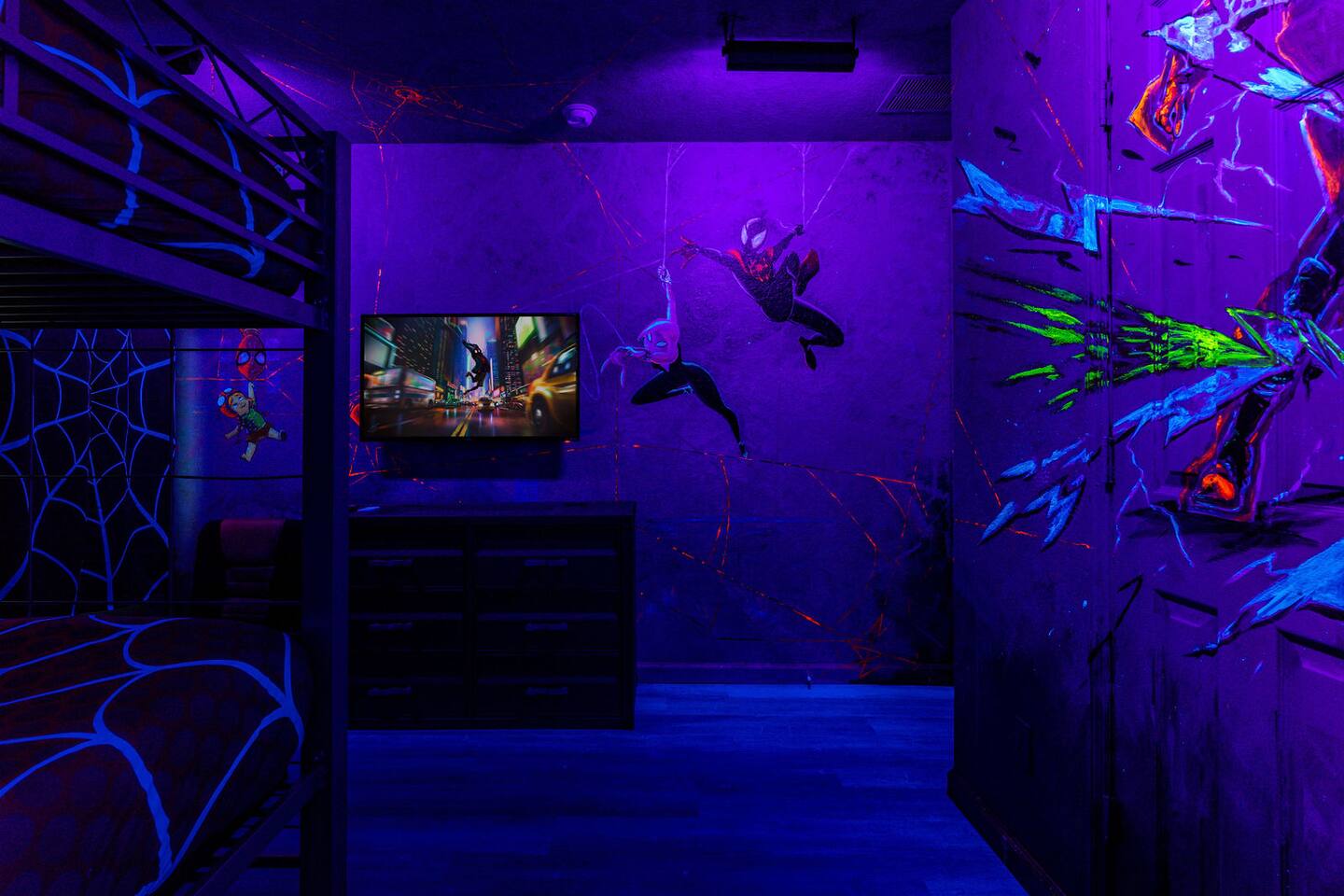 Race with Mario & friends on the Cosmic Rainbow! Video Walkthrough: https://www.youtube.com/watch?v=L3-kLuvDcc8 🏞️ Resort Clubhouse with Pool, Hot Tub, Water Slides, Arcade, Movie Theatre, Gym, Tennis, Basketball, Volleyball, Ping Pong, Pickleball, Park 🌌 Immersive Worlds: 🌈VR in Mario's Rainbow Bridge Arcade, 🧜♀️drift off in Ariel's underwater bedroom, 🕸️swing across the Spiderverse's action-packed bedroom 🍽️ Chef's Kitchen & Poolside Fun: Whip up feasts, chill by the heated pool 🎢 Minutes to Disney & Universal Studios! 🐾 Dog friendly
